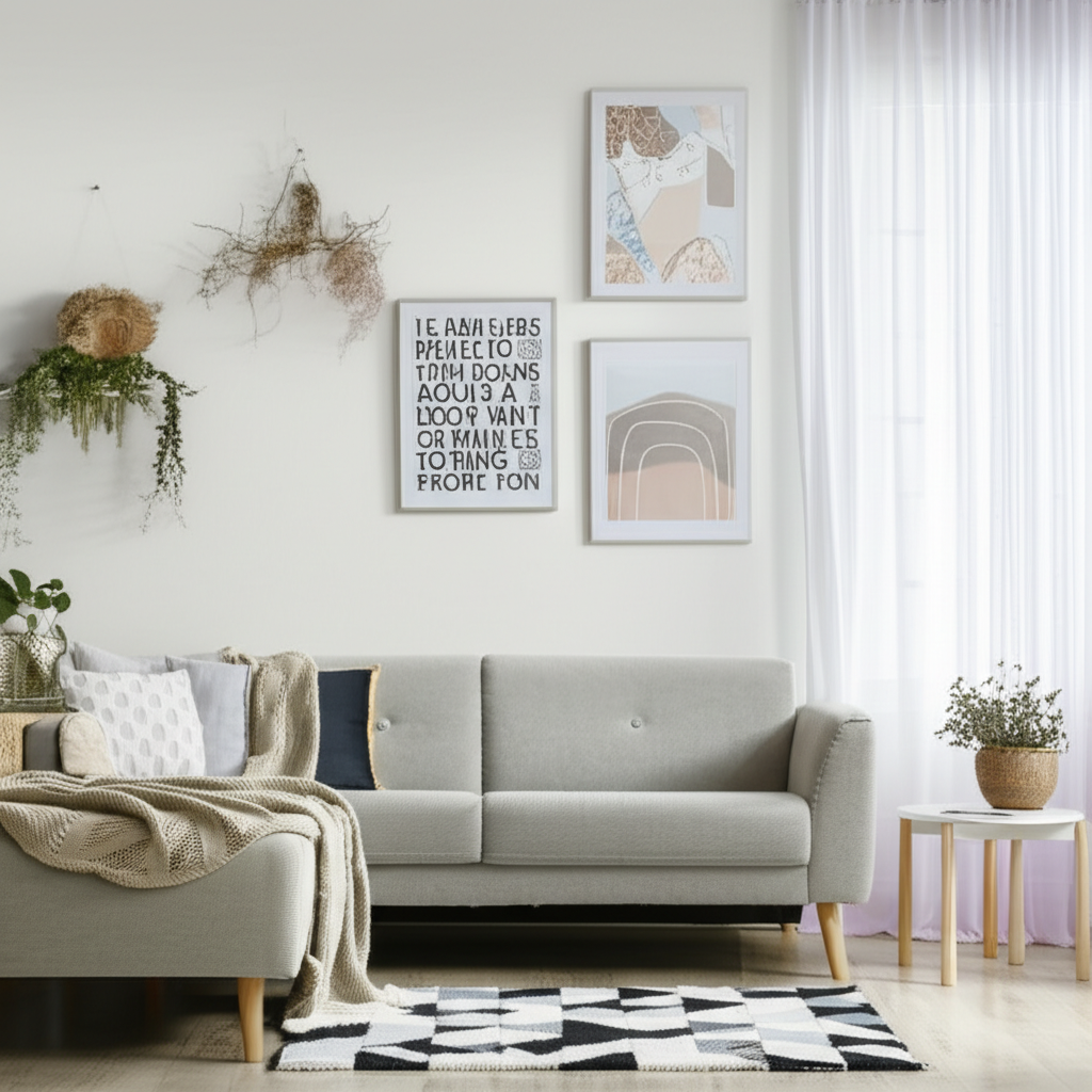 - Plan the layout: Lay everything out on the floor first to arrange them. Use painter’s tape on the wall to visualize placement.