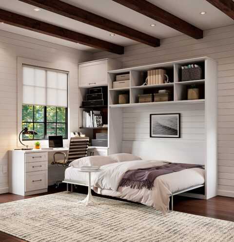 A sleek desk with sufficient surface area and built-in storage keeps your workspace organized. An ergonomic chair provides comfort for extended periods of work. Consider a multi-purpose nightstand or side table to hold essentials, and opt for minimalist design to preserve a tidy, open atmosphere.