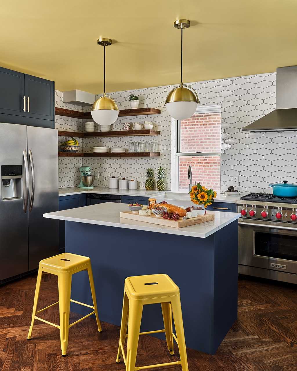 For a modern look, stick to clean lines and minimal decor. Use navy blue for cabinetry and add yellow through sleek, contemporary accessories.