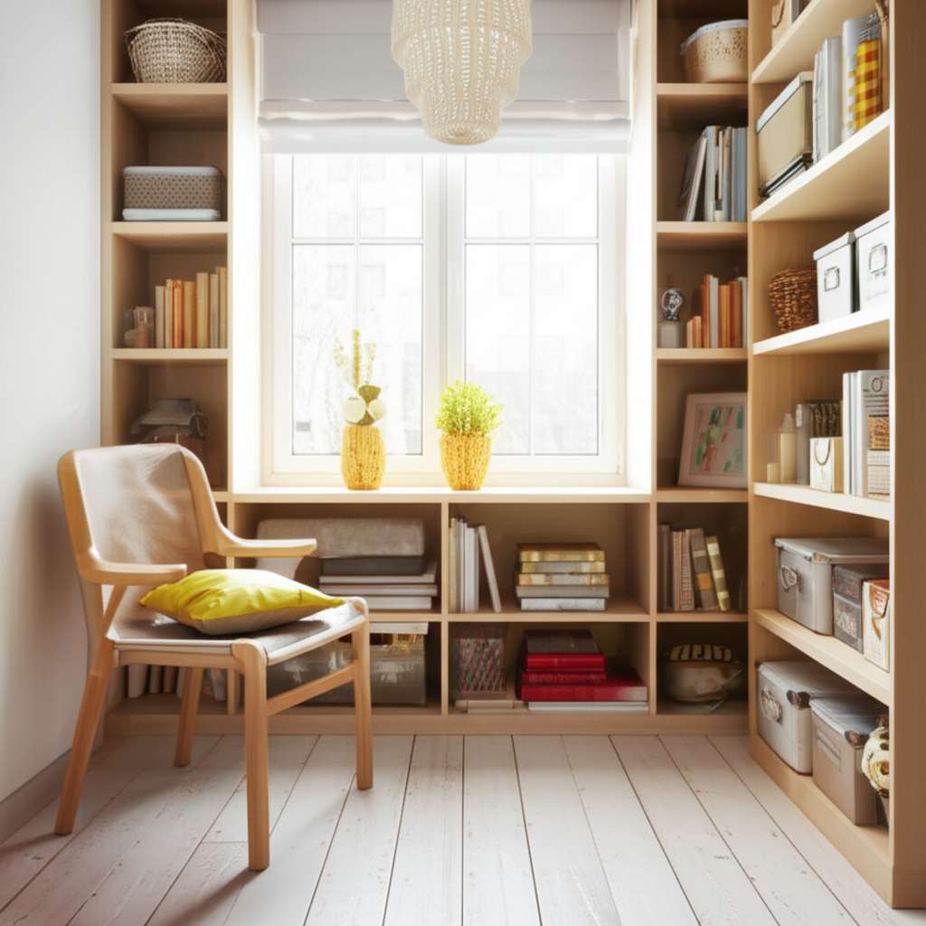 • Storage: Tall, narrow bookshelves or wall-mounted cabinets keep supplies organized and out of sight.