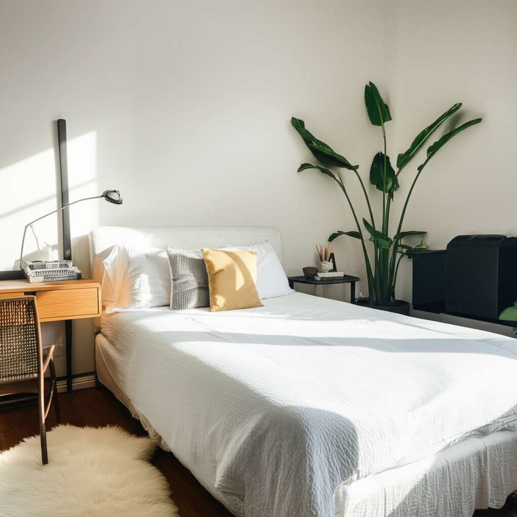 | Nightstand | On one side of the bed. | A slim, wall-mounted or floating nightstand saves floor space and keeps essentials within reach. |