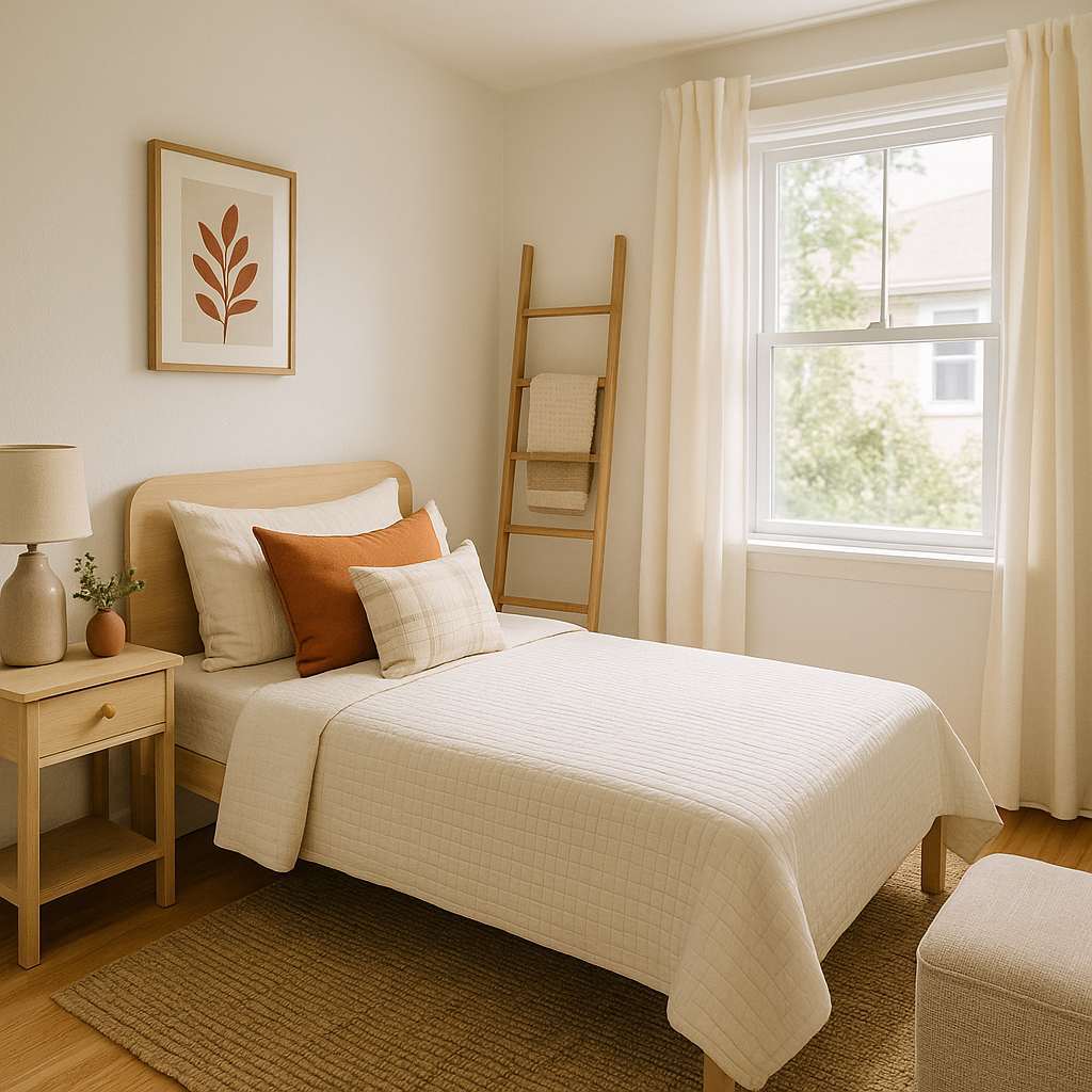 • Squarish small room: center a twin or full bed on one wall with slim nightstands or wall lamps.